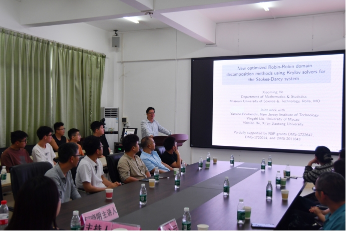 邀请,美国密苏里科技大学何晓明教授莅临湖光校区明德楼A座405会议室,为学院师生作了题为“New optimized Robin-Robin domain decomposition methods using Krylov solvers for the Stokes-Darcy system”的专题学术报告。报告会由学院院长彭小红教授主持,相关专业师生代表50余人到场聆听、交流。